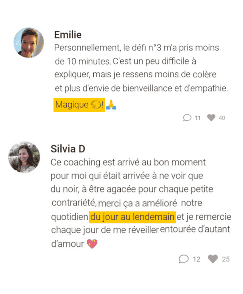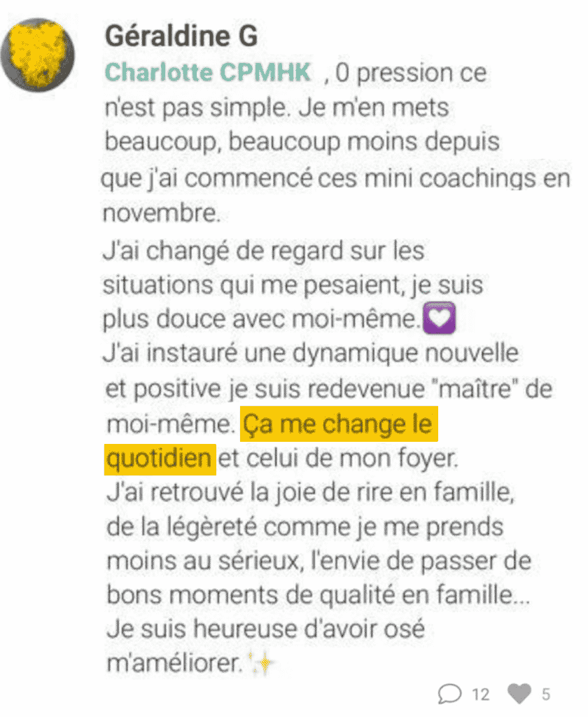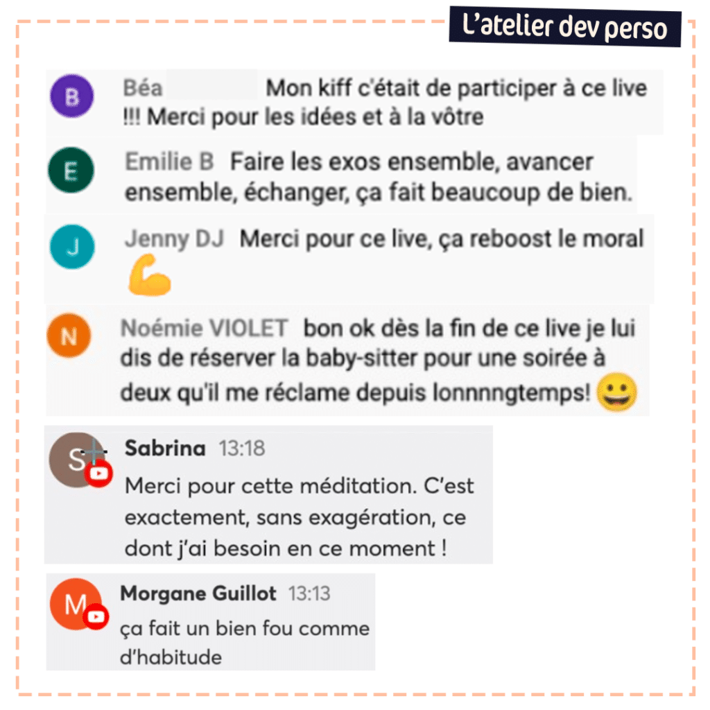 Un atelier de coaching live de dev perso (& replay) 👉 100% efficacité ! Tu ressors à chaque fois avec un poids en moins, ou de l’énergie en plus !