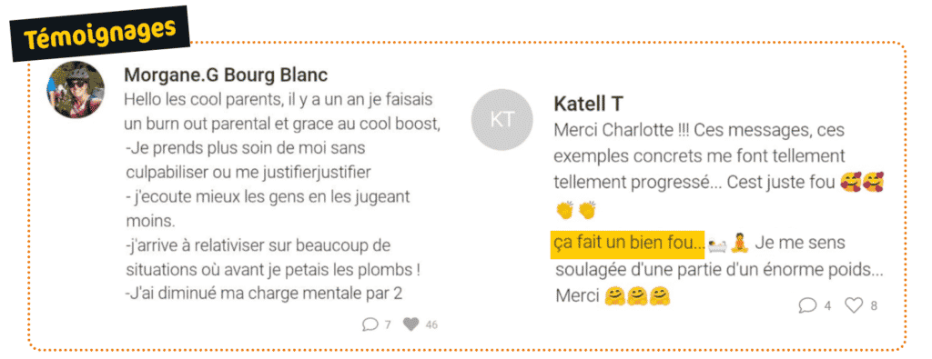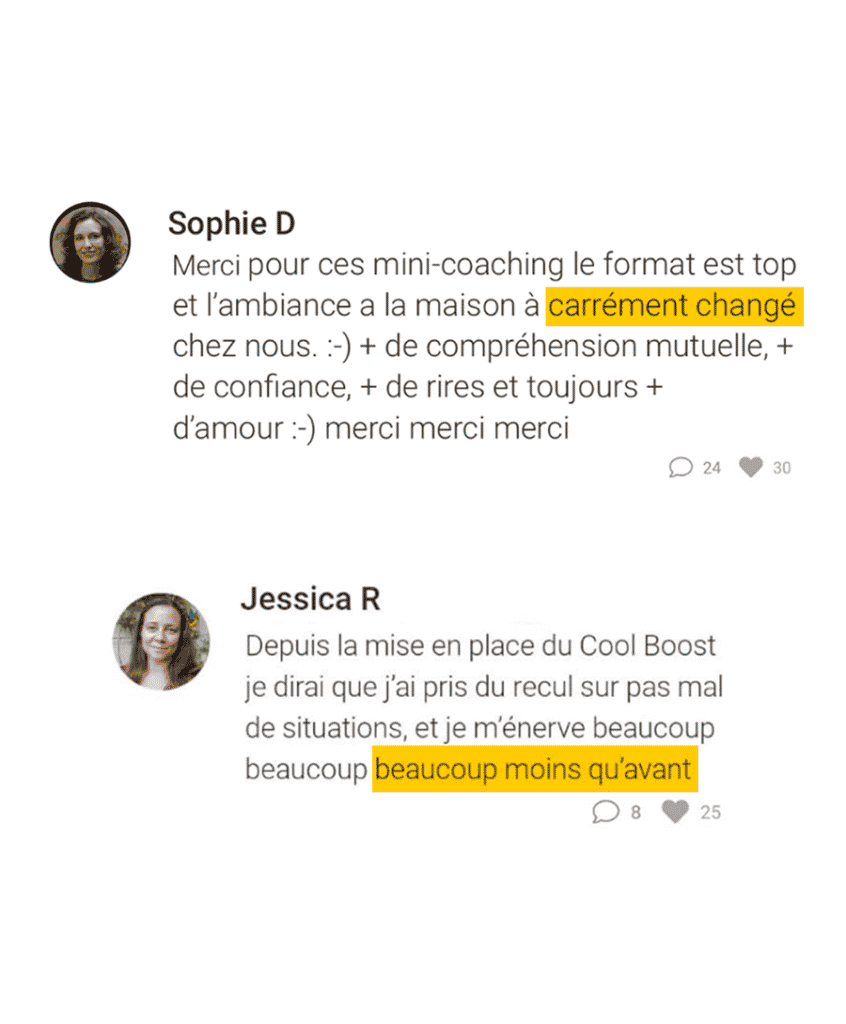 Le Cool Boost est un accompagnement qui a justement été conçu pour tous les parents qui n’ont pas le temps ! Tu accèdes chaque mois à ces 3 formats (3 x 1h) au prix d’un seul. Donc même si tu n’en suis qu’un seul chaque mois, ton abonnement est largement rentabilisé !