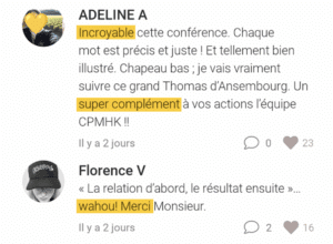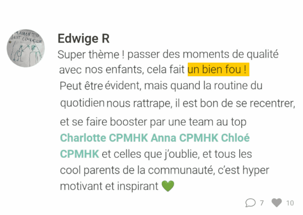 Tout au long du mois, la team CPMHK est présente dans les commentaires, pour te motiver et faire le point, ainsi que les autres Cool Parents ! Cette belle énergie collective, c’est la clé pour réellement se motiver à passer à l’action 🤫