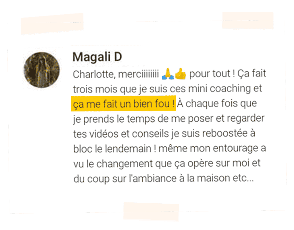 ✅ Chaque mois, un mini-coaching super efficace (on va droit au but ! ). 1 thème inédit chaque mois. Sous forme de vidéos de 5 min. En tout 30 minutes de visionnage (et en plus les vidéos sont, parait-il drôles… 😉). Puis, compter 30 minutes ensuite pour te poser, pour tes réflexions personnelles et prises de recul suite aux vidéos. Toutes les problématiques de ton quotidien y passent !