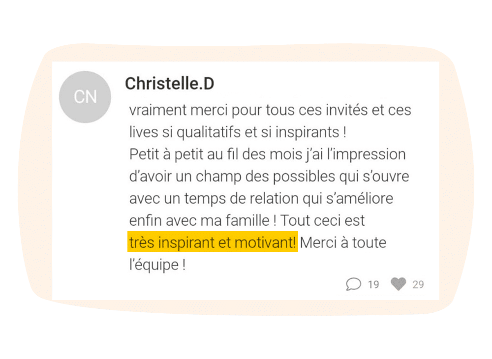 Les ateliers live sont sur la même thématique que le mini-coaching, mais on avance ensemble et en live ! On peut suivre l’atelier et le mini-coaching de façon indépendante. En juin et décembre, ce sont des ateliers de développement personnel, les Cool Parents adorent😍 !