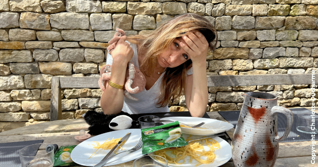 Au-début, on ressent souvent une grande fatigue… normal que certains ressentent une fatigue intense, de la lassitude et parfois même des insomnies face à cet inaccessible Everest de choses à faire. On note aussi de l’irritabilité ou encore de l’impatience. C’est une phase d’épuisement physique et mental à côté de laquelle on peut passer, parce que forcément, être parent / femme ou homme à tout faire / cuisinier·ère / compagne·on / travailleurs / ami / etc., c’est beaucoup de boulot !