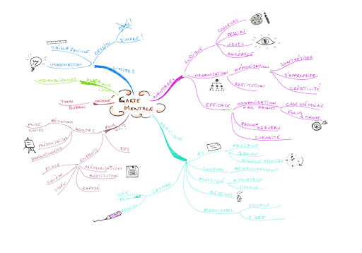 Ensuite, si vraiment le dessin ce n’est pas votre truc, 2 possibilités: ne pas en faire du tout (on perd quelques bénéfices du cerveau droit, mais il en reste d’autre), ou faire la carte mentale en numérique (il y a des logiciels avec des bibliothèques d’images, certains disponibles en ligne), même si on dit que le geste participe encore plus à la mémorisation.