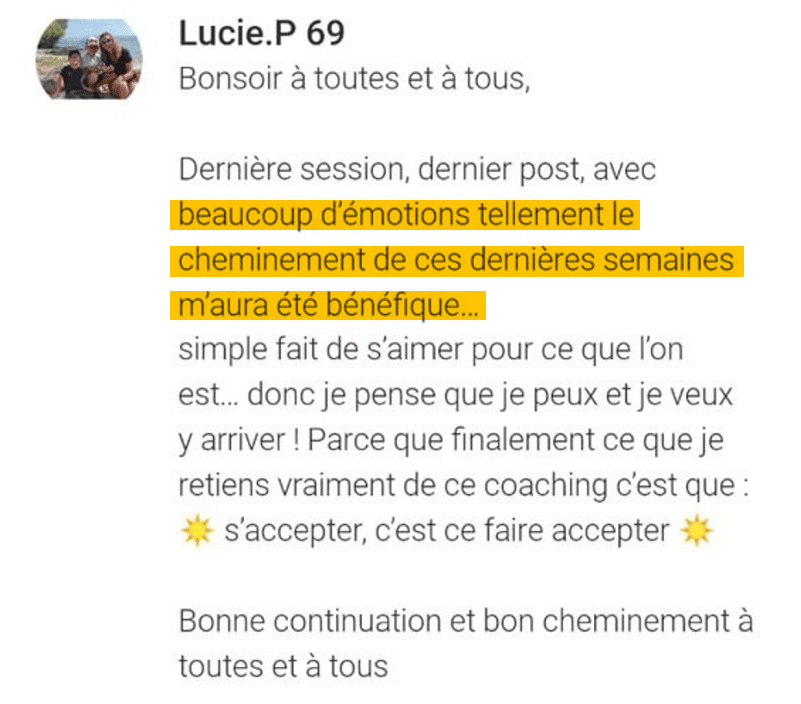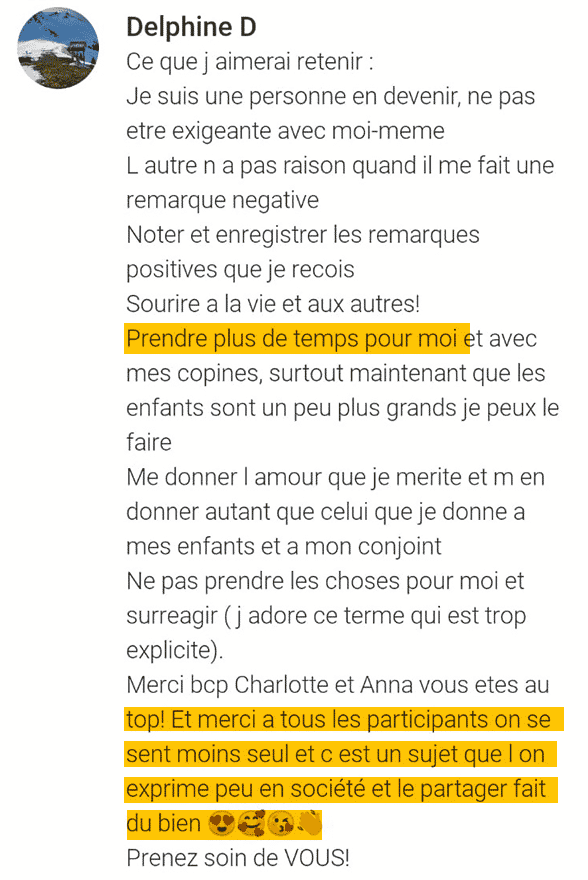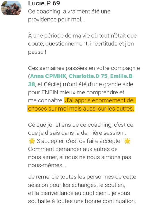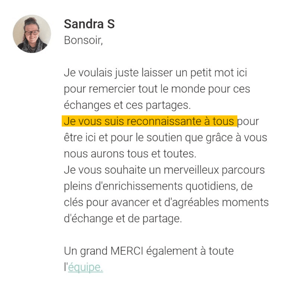 A chaque session : des espaces d’échange pour partager vos avancées et prises de conscience. L’équipe d’animation vous accompagne et l’énergie de groupe vous rebooste au quotidien!