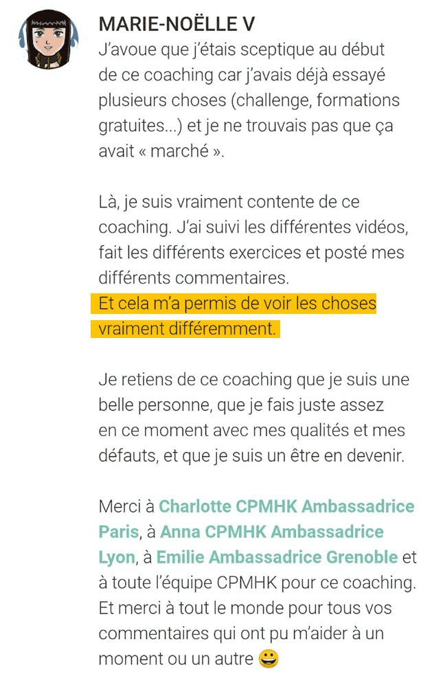 Très simple ! Il suffit d’avoir un téléphone et du réseau pour regarder les vidéos directement depuis l’application CPMHK, ou tu peux télécharger les vidéos depuis l’application, du coup plus besoin de réseau ! Bon à savoir, tu as également accès à la version audio du coaching, pratique ! Et bien sûr, tu peux emmener ton livret d’exercices avec toi, car il s’agit avant tout de réfléchir aux questions posées. Bref, c’est vraiment pensé pour s’adapter à la vie de tous les jours.