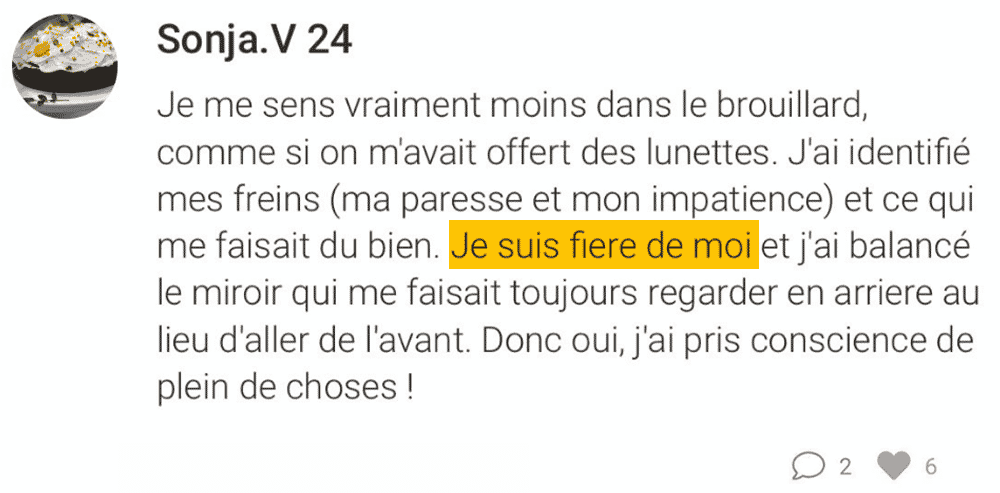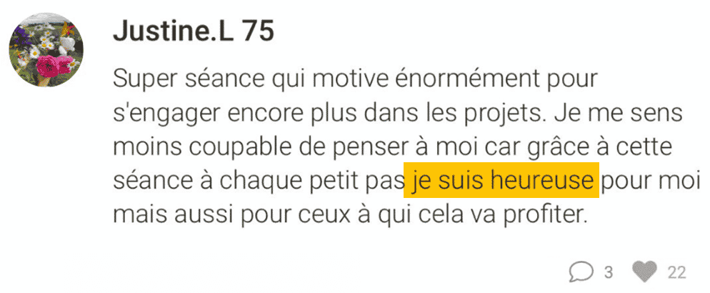 Ă chaque session : des espaces d’Ă©change pour partager tes avancĂ©es et prises de conscience. L’Ă©quipe t’accompagne, et tu peux profiter de l’Ă©nergie de groupe pour te rebooster au quotidien !