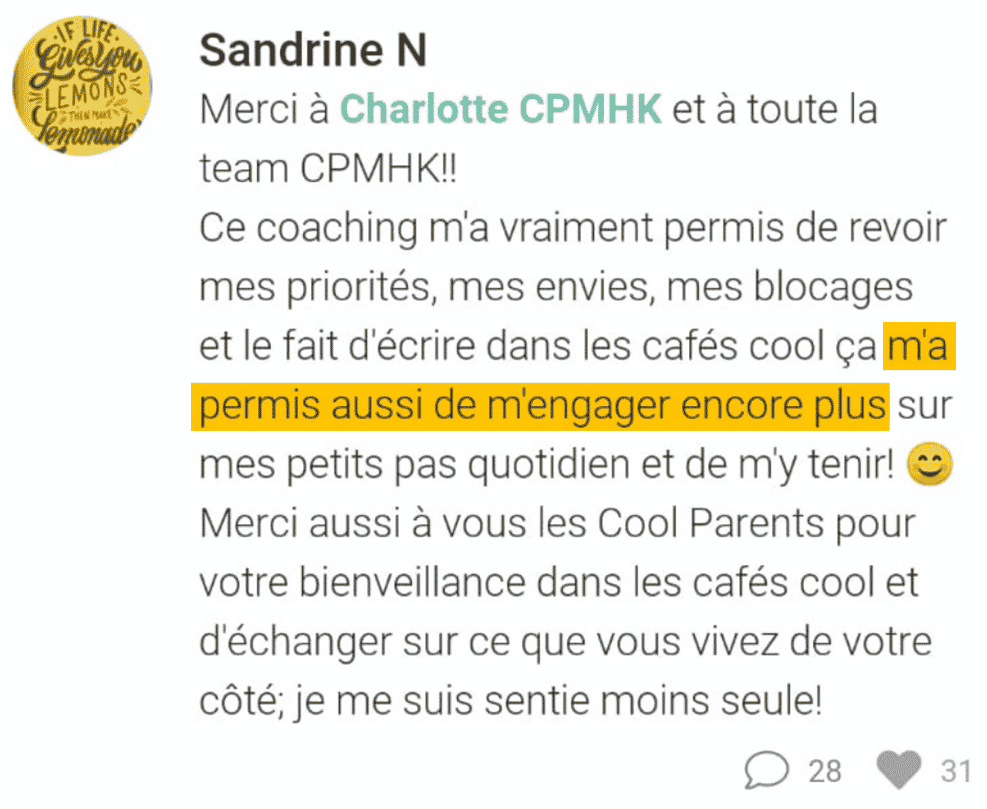 Chaque semaine, tu pourras leur poser tes questions dans les espaces dâĂ©change, on Ă©change entre Cool Parents. Charlotte pourra aussi faire quelques petites vidĂ©os personnalisĂ©es si le besoin se fait ressentir ! Objectif : ĂȘtre ensemble dans la dynamique !