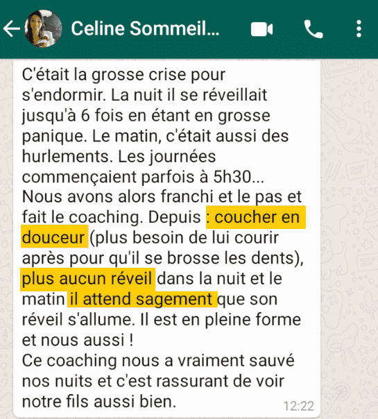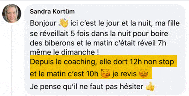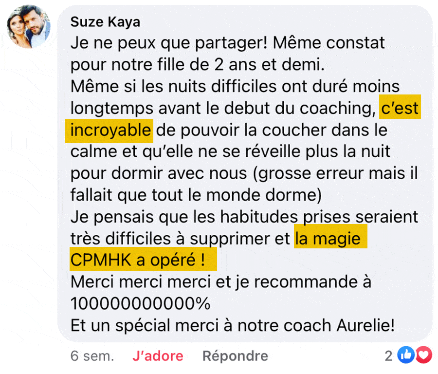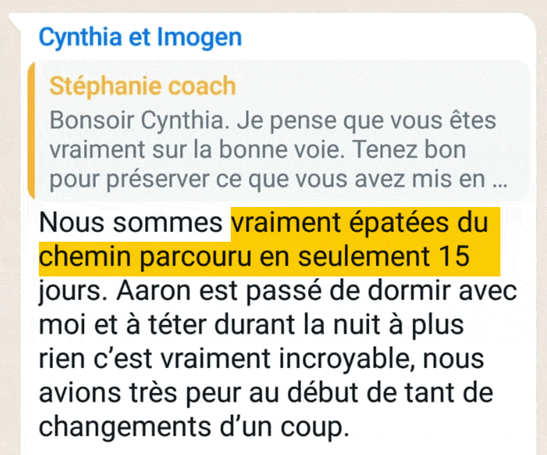 “Ce qui est fou dans ce coaching, c’est que ce n’est pas un truc en particulier qui a fait que notre enfant se couche enfin facilement, mais plutôt un changement de perspective chez nous, une énergie différente, qui au final a tout changé.”