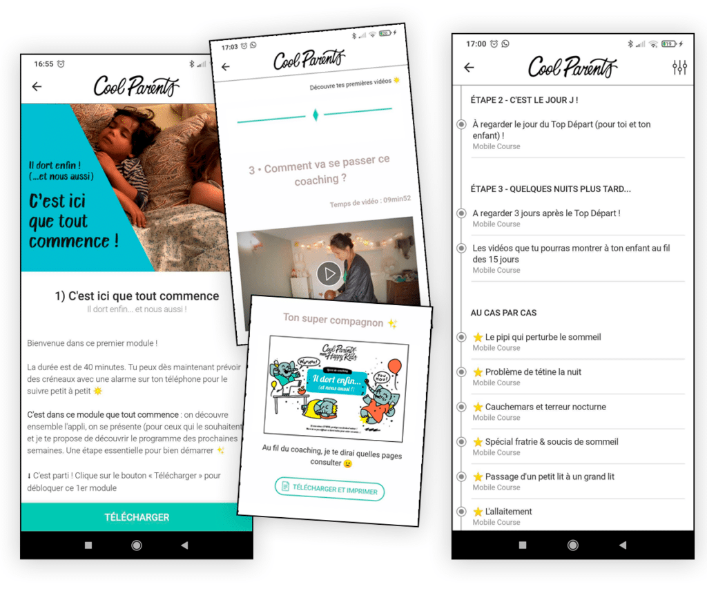 Dans ce programme vidéo, vous trouverez des guidelines ultra détaillées sur chacune des étapes qui impactent le sommeil : les siestes, la préparation, la soirée, le rituel du coucher, la nuit, le matin… Des passages sont joués sous forme de mini-scènes pour que vous puissiez prendre conscience de ce qui fonctionne et ce qui ne fonctionne pas.