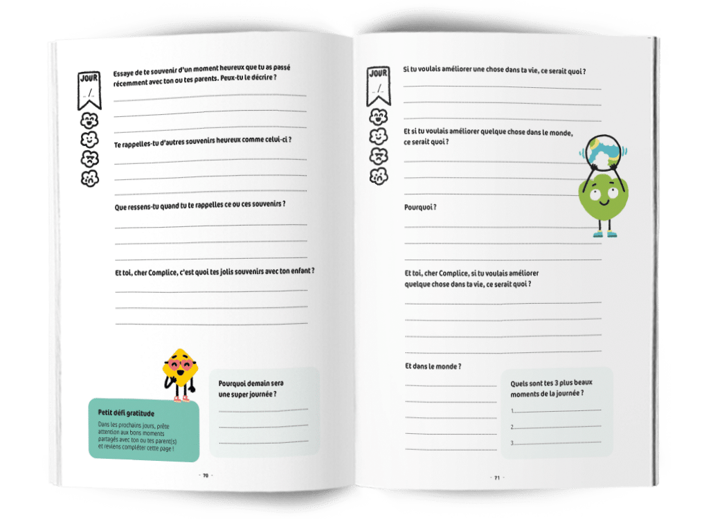 • Des mini-défis pour ouvrir les yeux sur les chances que l’on a, et  apprendre à montrer aux autres qu’on les aime 💫