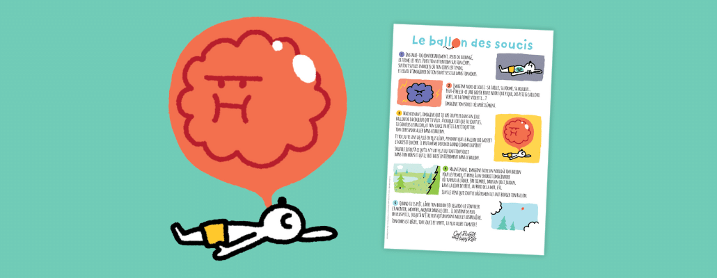 5 – Maintenant, imagine que tu vas souffler dans un joli ballon de la couleur de ton choix. À chaque souffle, tu gonfles le ballon, et ton souci quitte petit à petit ton corps pour aller s’y loger. Pendant que le ballon grossit et grossit encore, toi, tu observes l’évolution de chacune de tes tensions. Peut-être qu’elle se déplace, s’estompe, change… Au fur et à mesure, que le ballon se gonfle, prend le temps de redire comment la tension dans ton corps évolue.