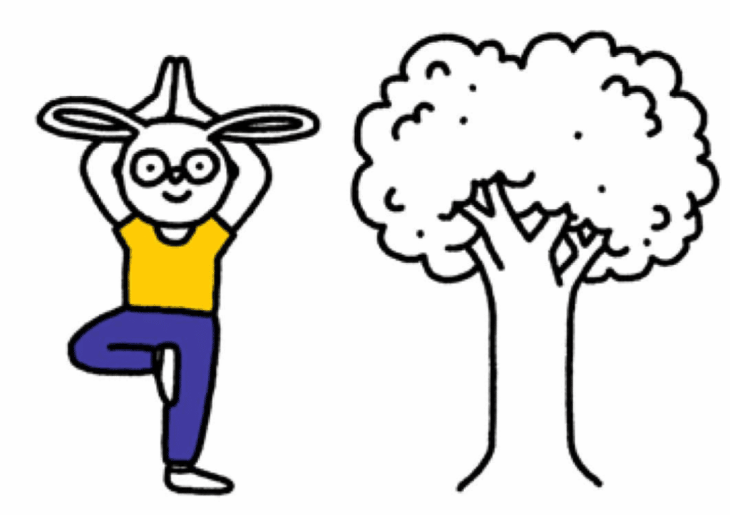 Debout, jambe droite pliée, je positionne la plante de mon pied gauche sur la jambe droite ; je lève les bras, les paumes des mains se touchent. Je suis si grand que je pourrais toucher le ciel ! Refaire la posture à gauche.
