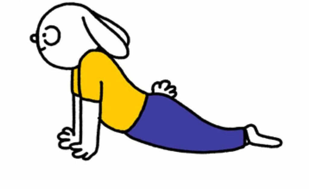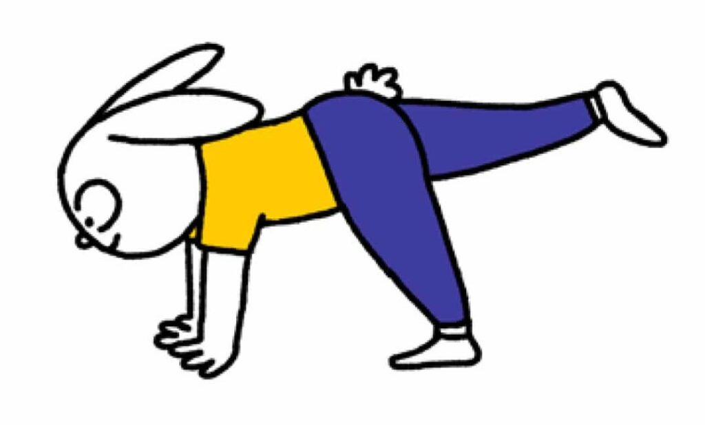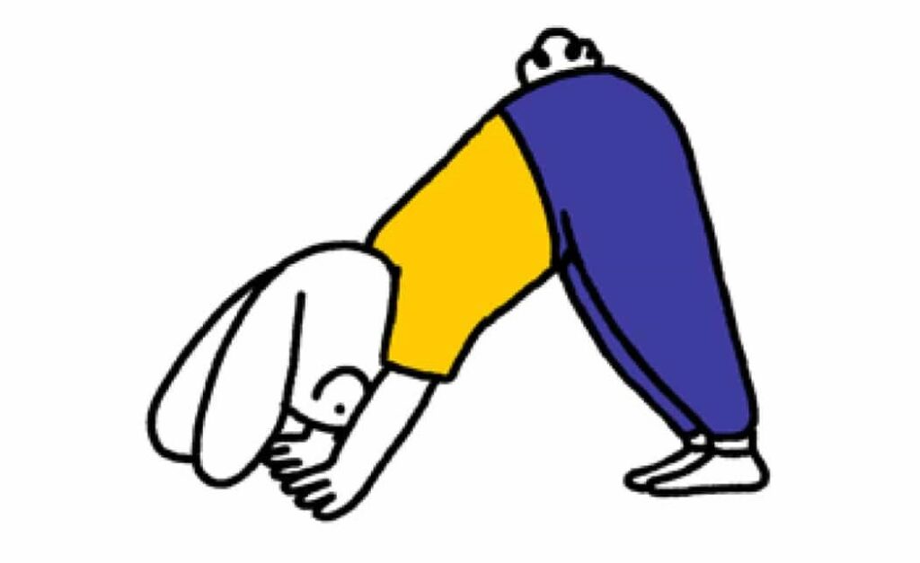 Depuis 4 pattes, je tends les bras et les jambes, et je pousse les fesses en arrière. Je peux imiter le chien joueur qui remue la queue. Je vois tout à l’envers, c’est rigolo !