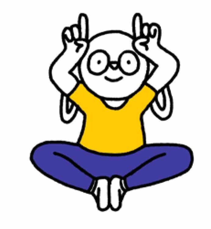 Assis en tailleur, on fait semblant qu’on tient un gros ballon entre ses mains en face de la poitrine. Puis on prend une grande inspiration  en écartant ses bras. On gonfle (comme si on gonflait le ballon). Puis on expire en ses mains l’une de l’autre. On recommence, gonfle encore, on écarte ses bras et ses mains. On recommence 3 fois. Comme si on gonflait à chaque fois un peu plus notre ballon.